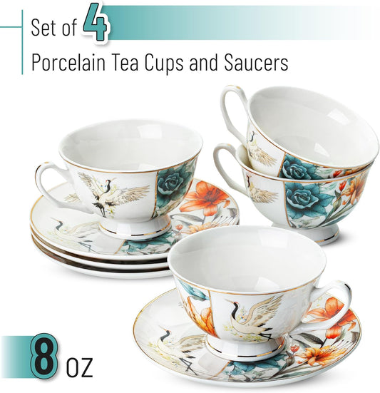 BTaT- Floral Tea Cups and Saucers with Gift Box, 8 oz, Tea Cups Set of 4, Cup & Saucer Sets, Tea Cup Set of 4