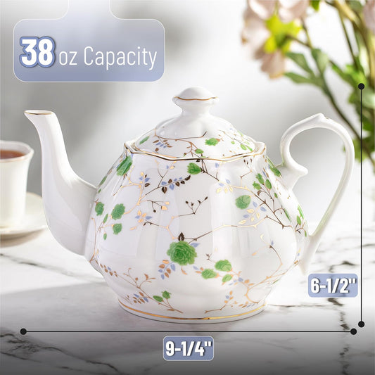 BTaT- Floral Tea Pot, Porcelain Teapot, 38 oz, Floral Teapot, Bone China Teapot for Tea Set