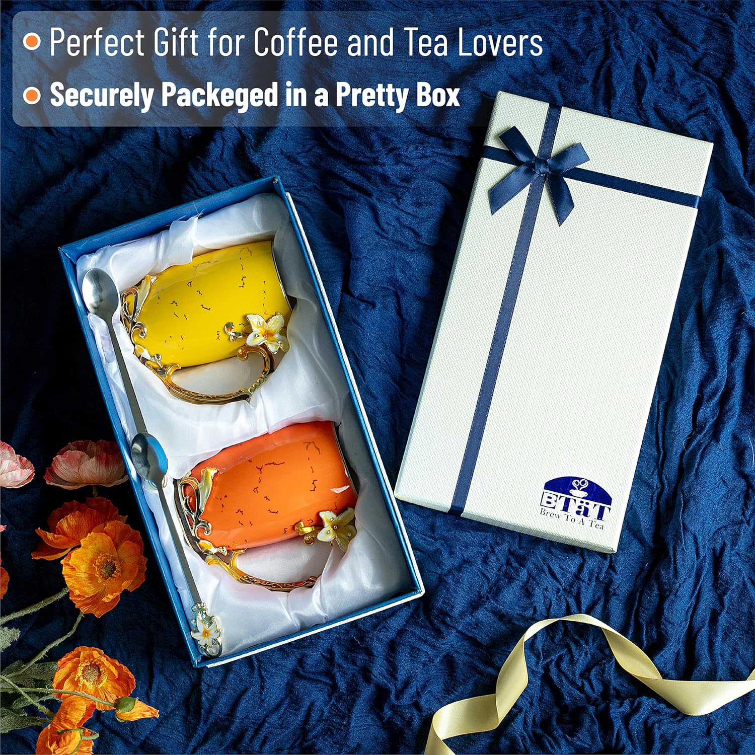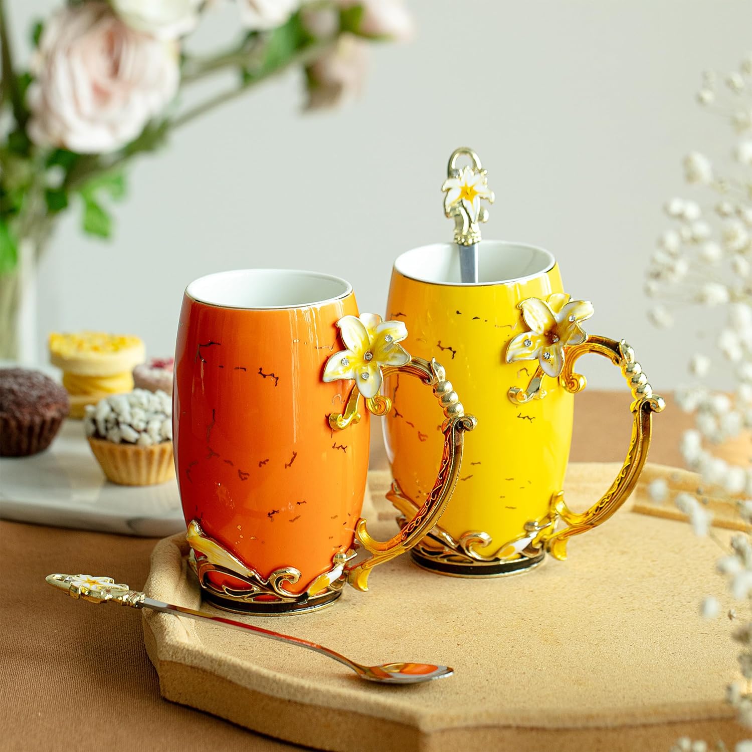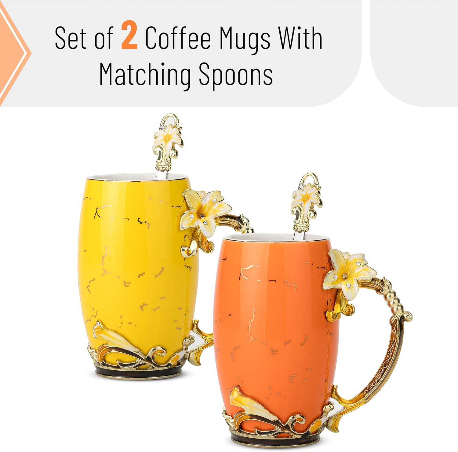 - BTaT fancy coffee mug set includes 2 beautifully crafted 12 oz mugs, each featuring a unique marbled design with orange and yellow tones, complemented by ornate floral accents and golden embellishments for a touch of luxury.