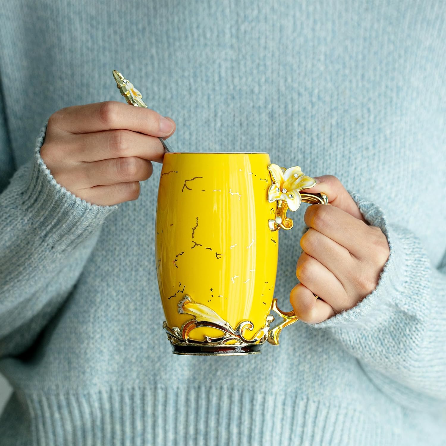 - Each mug boasts an intricately designed handle and a matching spoon, adorned with delicate floral details and elegant curves, making them a statement piece for any table setting.